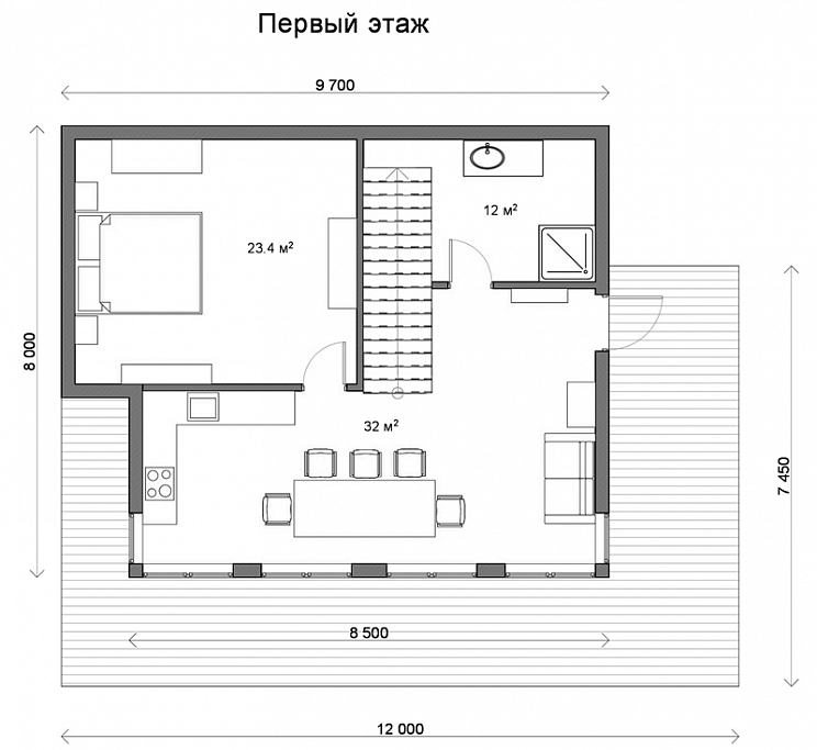 Классический проект Фахверк. Первый этаж выглядит весьма просторным. Дело в том, что его пространство абсолютно открыто: гостиная, кухня и прихожая-холл образуют единое помещение, из которого наверх ведет лестница. Кроме того, большое влияние на зрительное восприятие пространства и освещенность внутри дома стеклянный витраж большого формата и «второй свет». Прекрасная терраса с боковыми входами станет украшением Ваших вечеров и разместит большую дружную компанию.
